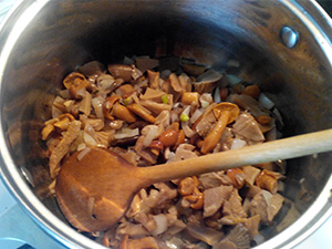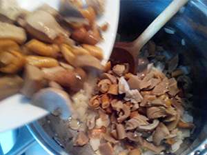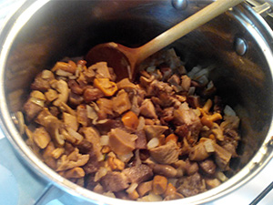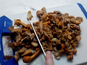Nato narežemo gobe na manjše koščke. Izbira vrste gob je popolnoma v vaših rokah. Priporočam mešane ali pa samo jurčke. |