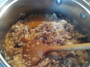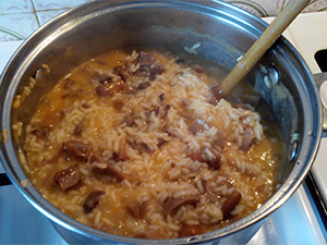 Ko se omako pokuha, vsujemo vanjo riž. Moč ogrevalne plošče sedaj zmanjšamo in riž kuhamo počasi, da se nam ne prime na dno lonca. |