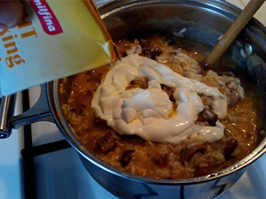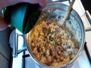 Sedaj rižoti dodamo 1dl smetane za kuhanje in premešamo. |