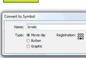Odpre se novo okno. V polje name vpišite poljubno ime in označite Movie clip. Kliknite na gumb OK. |