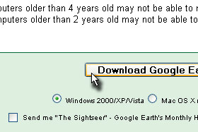 Označite svoj operacijski sistem in kliknite na gumb Download Google Earth. Jaz uporabljam okolje Windows, zato sem ga tudi označil. "The Sightneer" označite, če želite mesečno prejemati dodatna obvestila. |