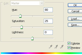 Označite Colorize. Hue nastavite 80, Saturation 25 in Lightness 0. Poigrajte se malo z nastavitvami. Kliknite na gumb OK. |