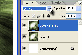 Dupliciranemu layerju določite senčenje na Overlay in Opacity na 30%. |