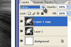 Določite dupliciranemu layerju senčenje na Lighten (glej sliko).