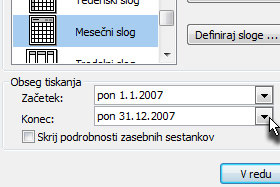 V polju Obseg tiskanja pa določite še Začetek in Konec, ki predstavljata datuma od in do, ki jih boste natisnili.