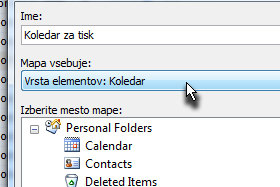 V polju Mapa vsebuje preko izbirnika določite Vrsta elementov: Koledar.