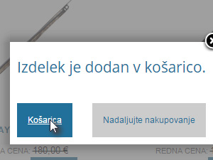 ![]() Prikazalo se vam bo okno, kjer lahko nakup dokončate tako, da kliknete na gumb Košarica. Lahko pa nadaljujete z nakupom tako, da kliknete na gumb Nadaljujte nakupovanje. |