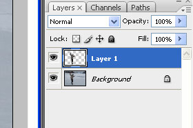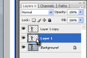Potem pa označite prvi duplicirani layer. V mojem primeru je to Layer 1. Držite tipko CTRL in kliknite na predogledno sličico poleg layerja (glej sliko), da ga boste označili. |