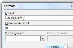 V oknu Formula pustite =SUM(ABOVE), kar pomeni, da bo seštel vse zgornje celice. V primeru, da so celice levo, namesto ABOVE vpišite LEFT. Seveda lahko tudi namesto formule SUM uporabite AVERAGE... Oblika zapisa števil preko izbirnika določite 0. V tem oknu se malo poigrajte. Kliknite na gumb OK. |