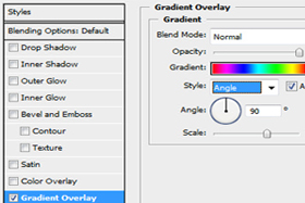 V stolpcu (levo) izberite Gradient Overlay. V Gradient Overlay pod Style izberite "Angle". Pod Gradient izberite "Spectrum". Ne zaprite še "Blending Options..."! |