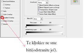 Kliknite zdaj na Layer "Shape 2" (drugi, majhen krog). Spet izberite "Blending Options...". Kliknite na Gradient Overlay kvadratek, da odstranite kljukico (mogoče kljukice ni več(pri meni je bila)). Skratka, kljukice pri Gradient Overlay NE sme biti. |
