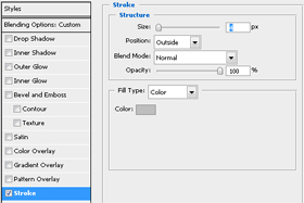 Pod "Blending Options..." moramo imeti obkljukano "Stroke" in "Inner Shadow". Pri Stroke sedaj nastavimo na 3 px. |