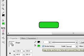 Ta lik bo predstavljal gumb, iz katerega se bo prikazal meni. Jaz sem narisal pravokotnik s Corner radius "10" (to lastnost nastavimo v oknu Properties. Kot Fill color sem izbral zeleno, za Stroke color pa črno barvo. V oknu Properties sem označil tudi Stroke hinting. Za velikost pravokotnika sem izbral 130×40. |