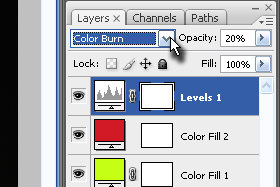 ![]() Sedaj pa nastavitvenemu layerju določite senčenje na Color Burn in Opacity na okoli 20% (glej sliko). |