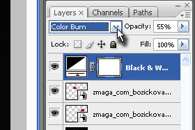 ![]() Sedaj pa nastavitvenemu layerju določite senčenje na Color Burn in Opacity na okoli 55% (glej sliko). |