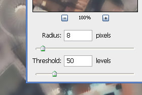 Odpre se novo okno. Radius določite 8 pixels in Threshold 50 levels. Kliknite na gumb OK. |