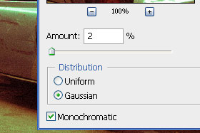 Združili ste layerje. Kliknite zgoraj na Filter, Noise in izberite Add Noise... Odpre se novo okno. Amount določite 2 % in Distribution označite Gaussian. Monochromatic tudi označite in nato kliknite na gumb OK. |