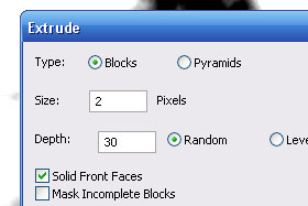 Odpre se novo okno. Type določite Blocks, Size 2 Pixels, Depth 30. Označite Random in Solid Front Faces ter kliknite na gumb OK. |