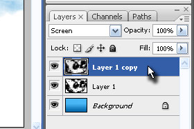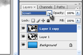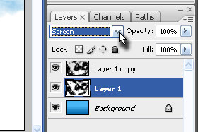 Označite Layer 1 in tudi njemu določite senčenje na Screen (glej sliko).