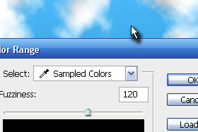 Kliknite zgoraj na Select in izberite Color Range... Odpre se novo okno, kjer določite Fuzziness 120. Potem pa z miško kliknite na prostor, kjer ni oblakov (nebo) in potrdite na gumb OK. |