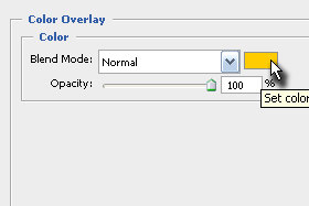 Kliknite zgoraj na Layer, Layer Style in izberite Color Overlay... V novem oknu kliknite na izbirnik barve in v polju # določite vrednost ffcc00 in potrdite barvo na gumb OK. Ne zaprite še okna... |