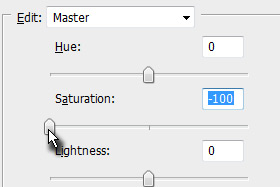 Pritisnite tipki Ctrl+U in nastavite Saturation na -100 (ali pa prestavite drsnik čisto na levo) in kliknite na gumb OK.