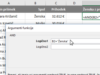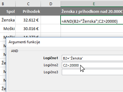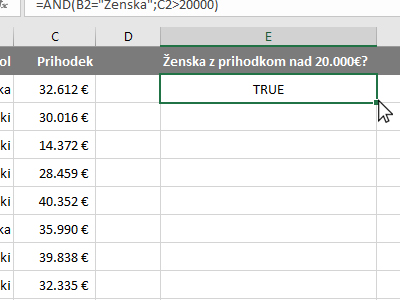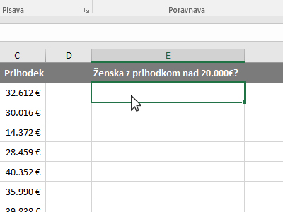 ![]() Potem pa kliknite v prazno celico, kjer boste izračunali, ali se v vrstici nahaja ženska z prihodkom nad 20.000 evri. |
