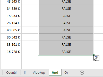 ![]() Excel je prikazal rezultat. TRUE pomeni, da celici izpolnjujeta obaja pogoja, FALSE pa bi pomenilo, da nista izpolnjena oba pogoja. Z miško označite izračunano celico in kliknite dvakrat na pikico v spodnjem desnem robu (glej sliko). |