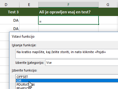 ![]() Pritisnite CTRL + F3, da odprete okno za vstavljanje funkcije. V novem oknu izberite kategorijo Vse. Potem pa v polju izbiranja funkcij poiščite, označite OR in kliknite V redu. |