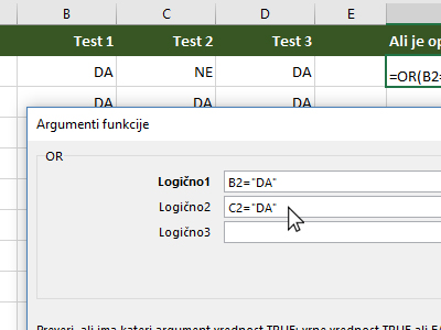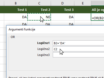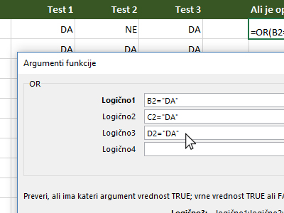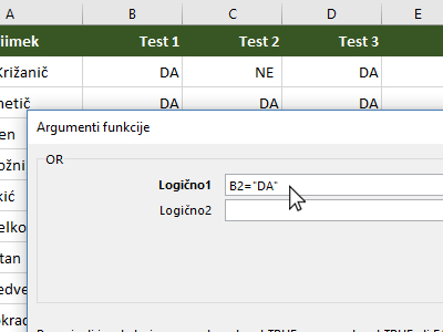 ![]() Kliknite še v polje Logično3 in označite celico, kjer se nahaja tretji rezultat in dopište ="DA" (glej sliko). Kliknite na gumb V redu. |