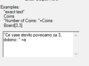 ![]() V simbol Output vpisemo tako kot na sliki. V edini okvir vpišemo, kaj se nam izpiše (v mojem primeru "Ce vase stevilo povecamo za 3, dobimo: " +a). |