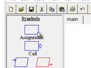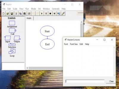 ![]() Program odpremo. Prikaže se nam glavno okno, kjer bomo risali diagram in ga tudi pretvorili v program ter MasterConsole, kjer se nam izpišejo določeni podatki med izvajanjem programa. |