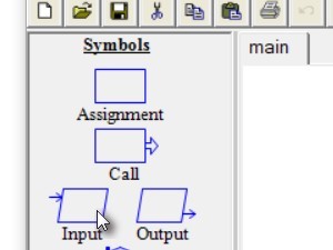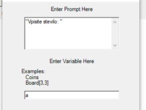 ![]() V simbol Input vpišemo tako kot je na sliki. V zgornji razdelek vpišemo "Vpisite stevilo: "(to se bo izpisalo), v spodnjega pa samo a (to je ime spremenljivke). |