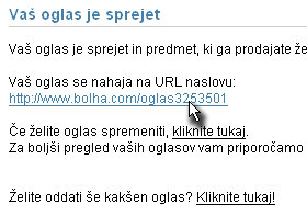 Želim vam uspešno prodajo artiklov. Ko se bo nekdo zanimal za vaš oglas, boste prejeli e-mail v vaš e-poštni nabiralnik. Kar precej ljudi pa vpiše svojo mobilno številko v polje Podrobnejši opis, ki sem ga opisal pri koraku 12 in tako pohitri prodajo (je pa vaša številka vidna vsem in ne samo registiranim uporabnikom!). |