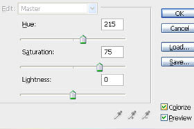 Potem pa nastavite Hue 215 in Saturation 75. Potrdite na gumb OK. |