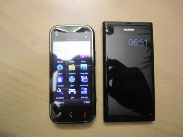 Telefon je za moje pojme ravno prav velik, tanek in se ga zelo dobro drži v dlani. Predstavljajte si iPhone 4, ki je podaljšan za kak slab centimeter. Drugače pa si lahko na spodnji fotografiji pogledate primerjavo med Nokia N9 in NOKIA N97 mini.