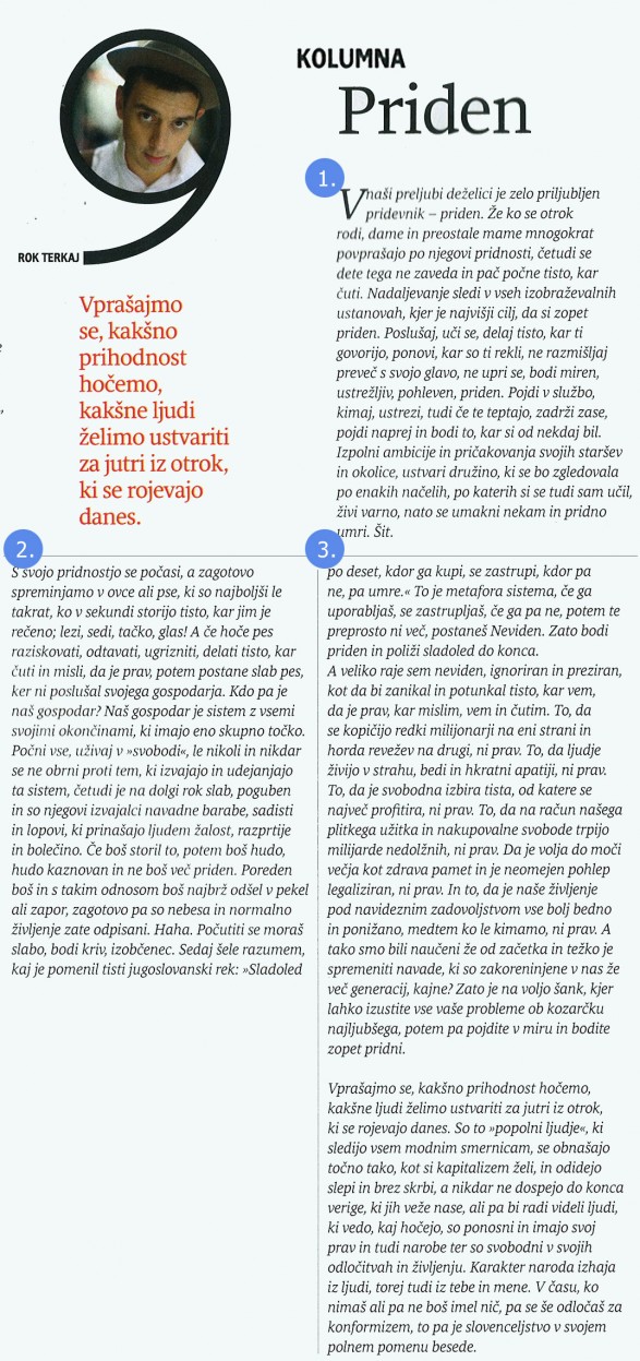 Po e-pošti sem od prijateljice dobil zanimivo kolumno, ki jo je za moje pojme eden najboljših raperjev pri nas napisal v neki reviji. Priporočam branje in zanima me vaše mnenje o tem članku?