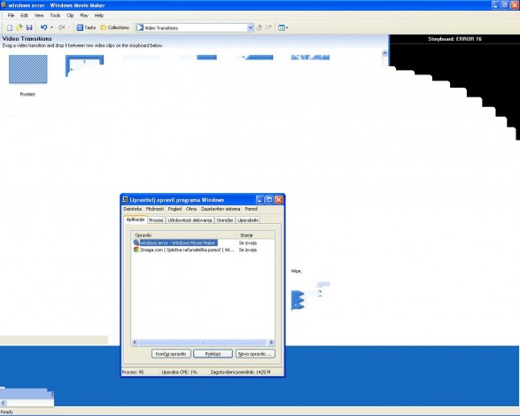 Ko dodam kakšen učinek ali kaj podobnega, mi program "zašteka". Nato odprem upravitelja opravil, ga premaknem in v Windows Movie Makerju se pokaže vse belo. Tako ga moram z upraviteljem opravil "ubiti", nato pa ga ponovno odpreti. Seveda se mi ne da vsakih 5 sec klikati shrani, saj shranjuje vsaj 3 sec. Tako video posnetek ne bo NIKOLI dokončan!