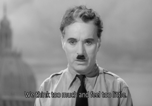 Odličen govor, ki ga je uprizoril Charlie Chaplin v filmu Veliki diktator (The Great Dictator). Priporočam ga vsem, ki ga še niste gledali ali pa ne poznate, saj je zelo navdušujoč in pozitiven, kljub temu, da igralec igra velikega diktatorja.