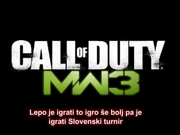PozdravImam idejo ustvariti turnir v Modern warfare 3.Moramo še malo počakati zaradi spletne strani itd lahko pa napišete in sestavite skupino svojih prijateljev ali kaj drugega?Nevemo ali turnir bo moramo pa biti v pripravljenosti?:DNe me držati za besedo ker nisem sigurer, kolikor sem pa že rekel moramo biti v pripravljenosti?:D