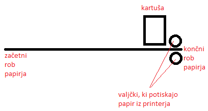 Mislim, da ima androgrizli kar prav. Printer ne more naprintati na spodnji rob papirja, ker je kartuši v napoto mehanizem za premikanja papirja skozi printer. Ko pride papir do te točke, da bi printal po spodnjem robu, ga mehanizem spusti ven in ni več pri miru, posledično kartuša ne bi natisnila natančno in sploh ne natisne.Še skica za lažjo predstavo: