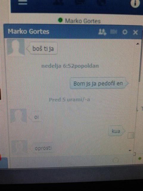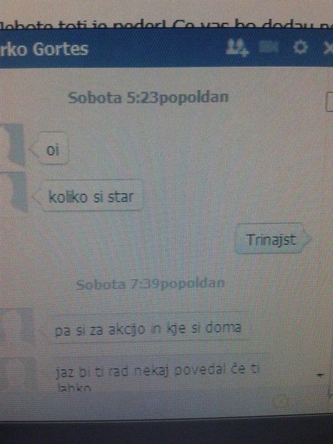 mr_jaka, ne strinjam se. Pri tisti objavi z "klovni in pajaci" je bila tista žalitev dokaj rahla, tale pedofil pa nagovarja mladoletne otroke, bog ve kaj bi se zgodilo če bi kakšen naivnež nasedel in bi se srečala... Ta nagnusen človek, če mu sploh lahko rečemo tako, bi si zaslužil kastriranja in morda celo zaporne kazni!