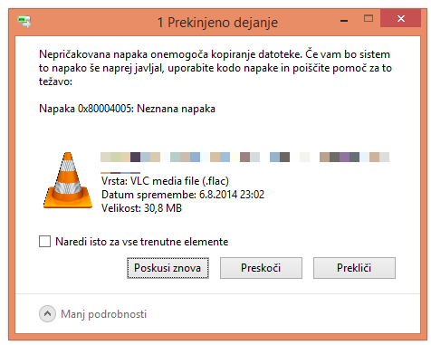 Imam Windows 8. Danes sem hotel razširiti eno zippano mapo. Z raziskovalcem jo lahko odprem, ko pa želim razširiti njeno vsebino (notri je glaba v formatu .flac), pa dobim error: Napaka 0x80004005: Neznana napaka. Prilagam slikco. Sem probal tudi s programom 7zip, vendar dobim error "Nepodprta metoda stiskanja".