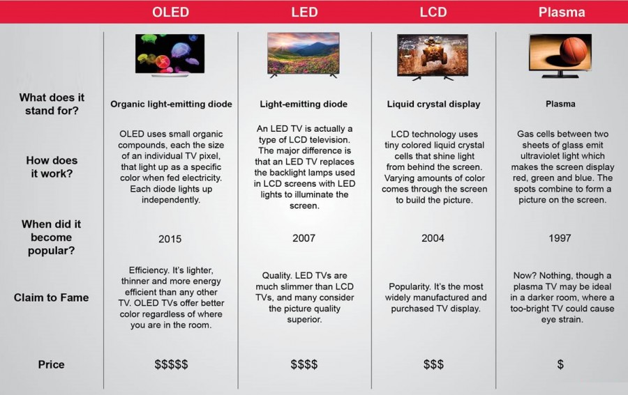 Na spodnji sliki si lahko (sicer v angleškem jeziku) pogledate razlike med OLED, LED, LCD in Plasma zasloni. Mogoče vam bo prav, lahko pa tudi podate kak komentar na to temo.