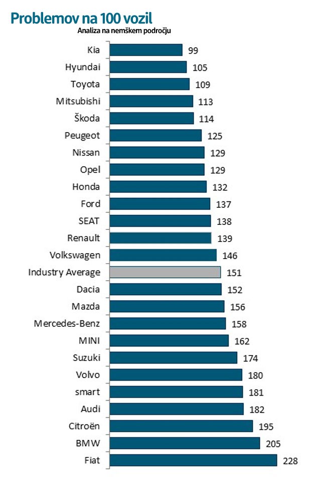 V zadnji raziskavi za nemški trg so analizirali 71 modelov. Med znamkami se je najbolje odrezala Kia, najslabše pa Fiat. Glede na to, da se po slovenskih cestah vozi veliko število vozil, kot rabljenih uvoženih prav iz Nemčije, je zato analiza dobrodošla tudi za slovenske lastnike vozil.
