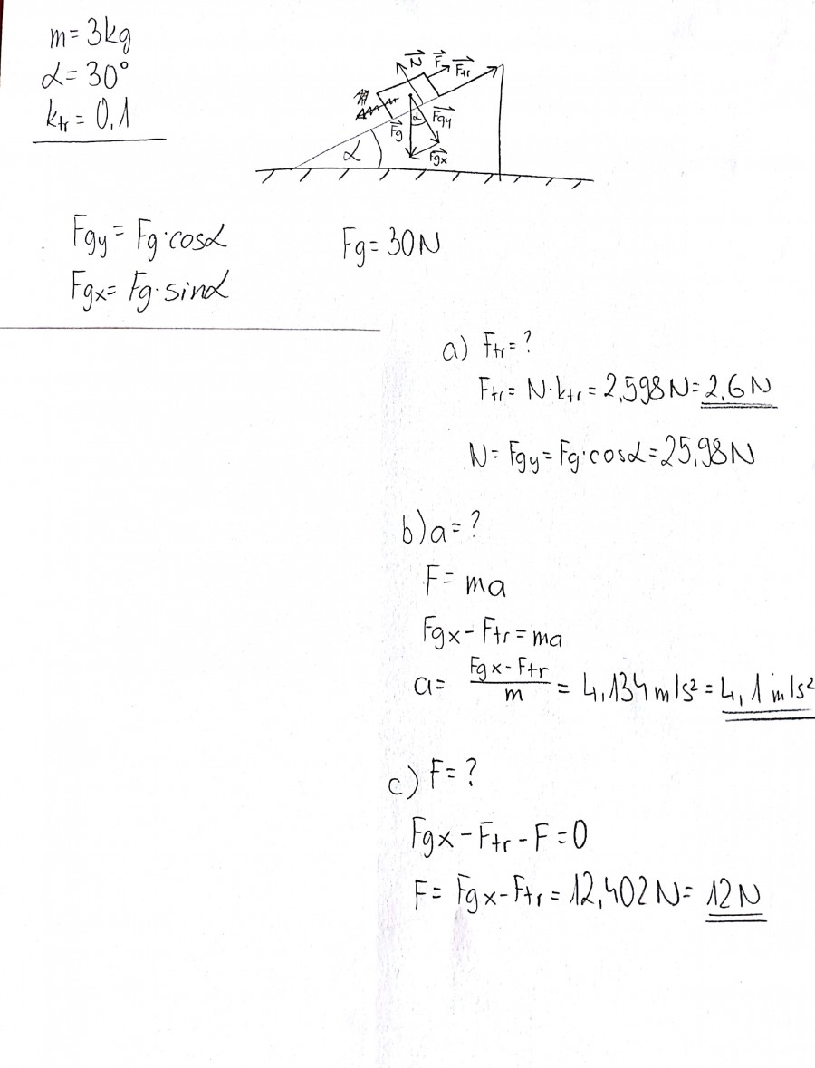 Na hrapavi klanec položimo kocko mase 3kg. Nagib klanca je 30°, koeficient trenja pa 0,1. a) Kolikšna je sila trenja? b) S kolikšnim pospeškom drsi? c) S kolikšno silo in v kateri smeri moramo delovati na kocko, da miruje?