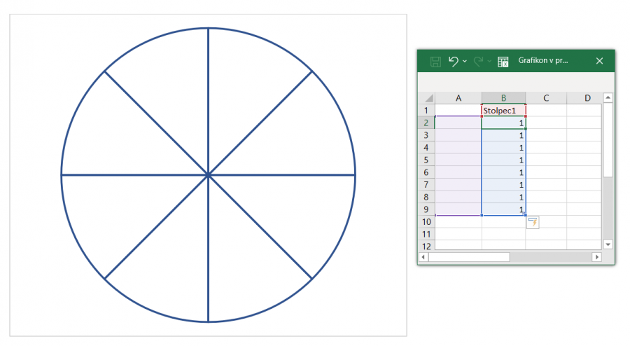 Prva ideja, ki mi pade na pamet, je tortni grafikon z enakimi deleži. Torej Vstavljanje > Grafikon > Tortni grafikon, nato pa se v podoknu za oblikovanje nastavi belo barvo in temno obrobo.