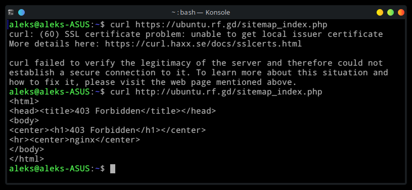 Ko spletno stran poiščem z ukazom: curl https://ubuntu.rf.gd/sitemap_index.xml dobim napako 403 (URL Forbidden) v obliki HTML strani.