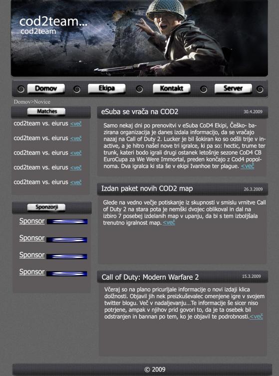 Kot si že rekel: črko so prevelike, ko pišeš te novice probaj dati malo več razmaka med vrsticami, pa pri gumbih Domov, Ekipa, Kontakt, Server, Matches, Sponzorji probaj bolj izostrit sliko, drugače se mi pa zdi kar vredu.