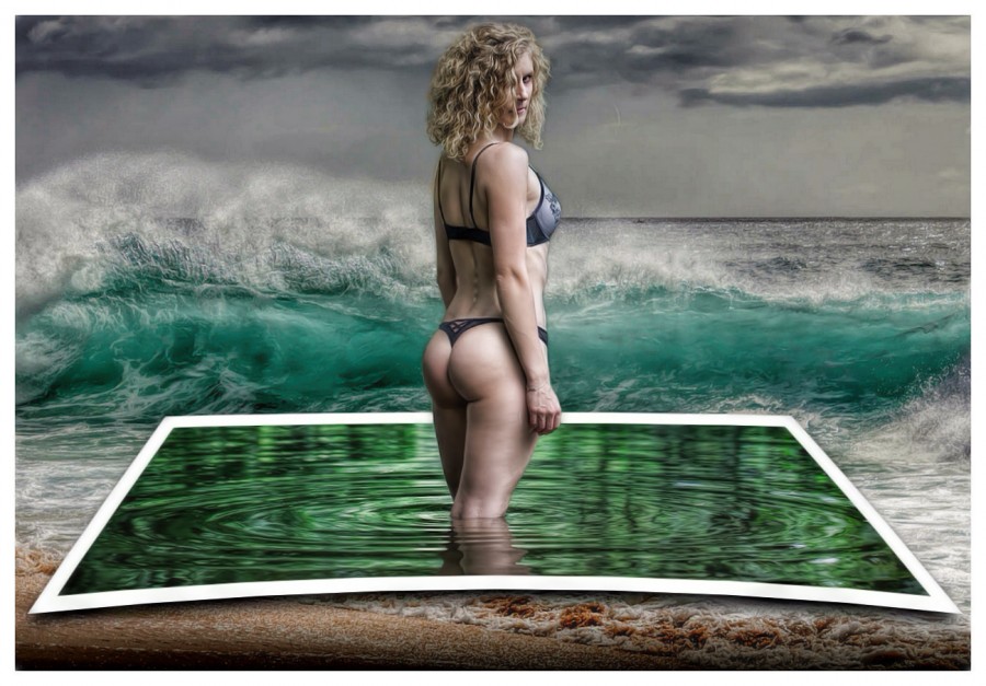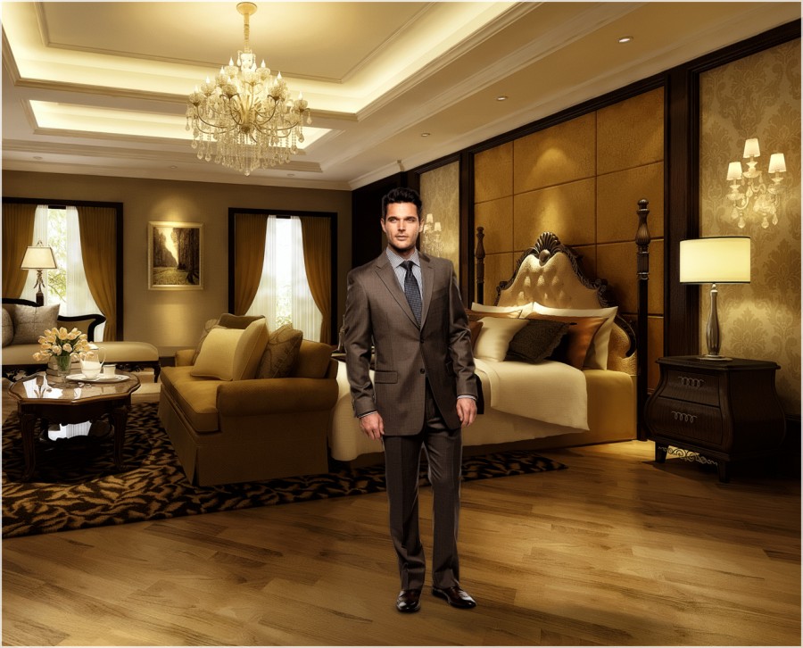 Sama selekcija je dokaj v redu, blending pa na meji dobrega/slabega - prelisičil bi neizkušeno oko. Temperatura barv se skoraj ujema, z minimalnimi spremembami bi bilo popolno. Absolutno manjka senca na tleh od zgornje luči, mogoče tudi manj vidna od desne luči. Največja napaka je sama osvetlitev. Moškega bi moral osvetliti glede na vire svetlobe v sobi - torej zadaj in z njegove leve. Očitno gre za studijsko fotografijo, kar pomeni precej dobro podlago za spreminjanje osvetlitve. Sam bi uporabil layerje s clipping mask ter Soft Light in Overlay mode za dodajanje senc in poudarkov. Prav tako bi moral potemniti robove selekcije.
